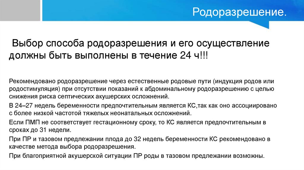 При ПР и тазовом предлежании плода до 32 недель беременности КС рекомендовано в