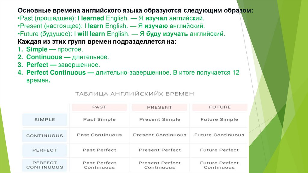 Основные времена английского языка образуются следующим образом:•Past (прошедшее): I learned English. — Я изучал английский.