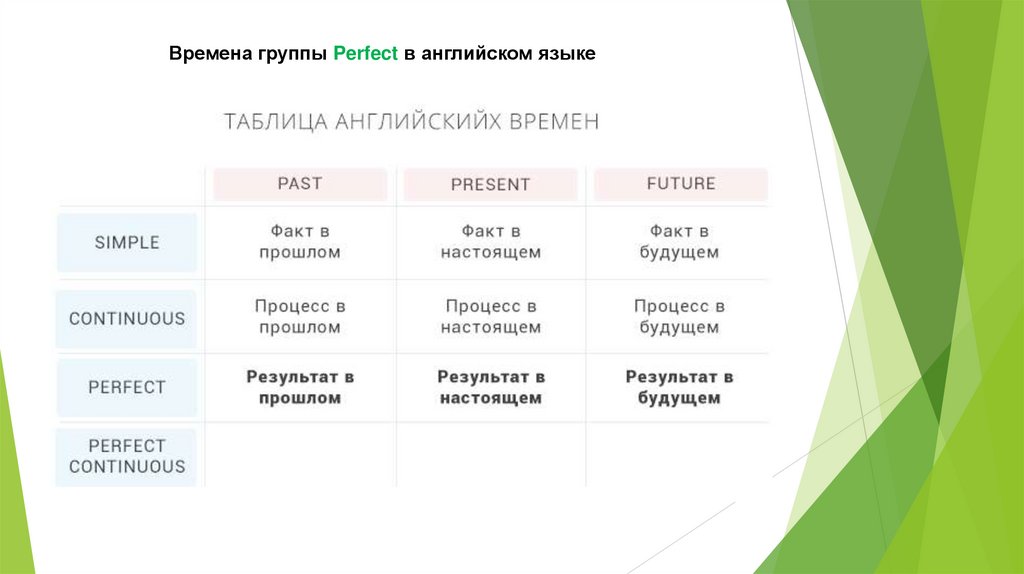 Времена группы Perfect в английском языкеЭто время мы используем, когда делаем акцент на результате действия, который: