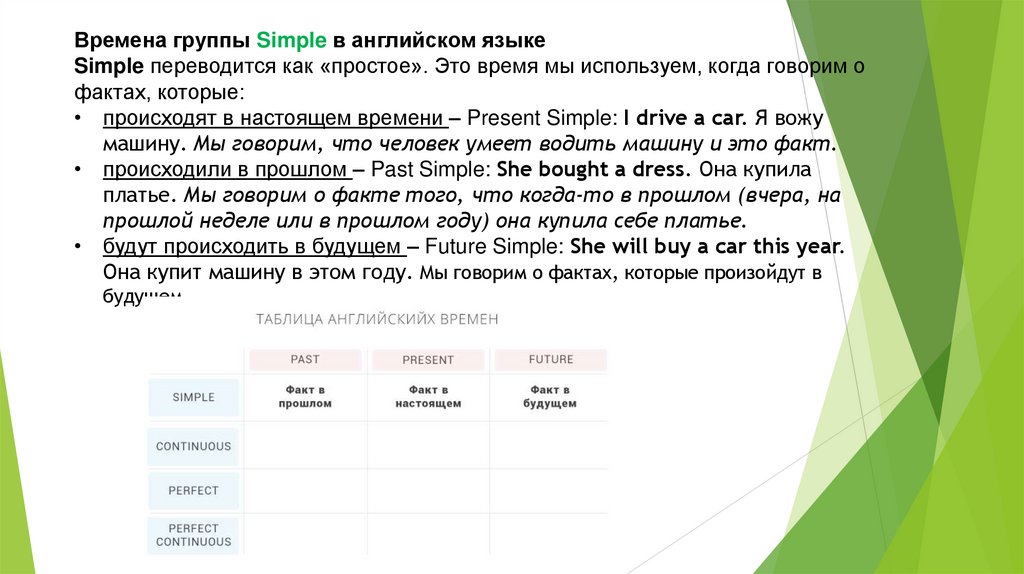 Времена группы Simple в английском языкеSimple переводится как «простое». Это время мы используем, когда говорим о