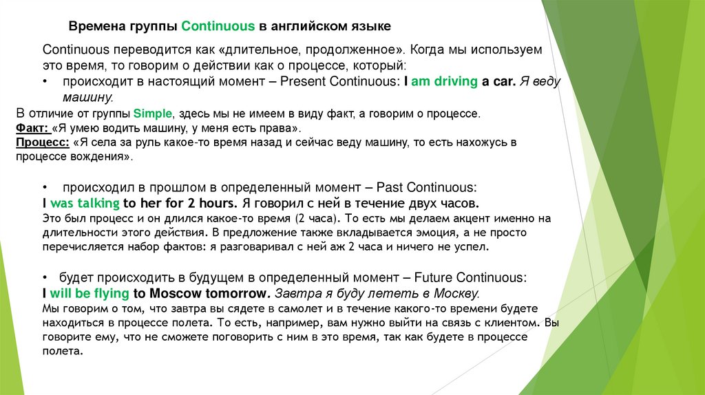 Времена группы Continuous в английском языкеContinuous переводится как «длительное, продолженное». Когда мы используем