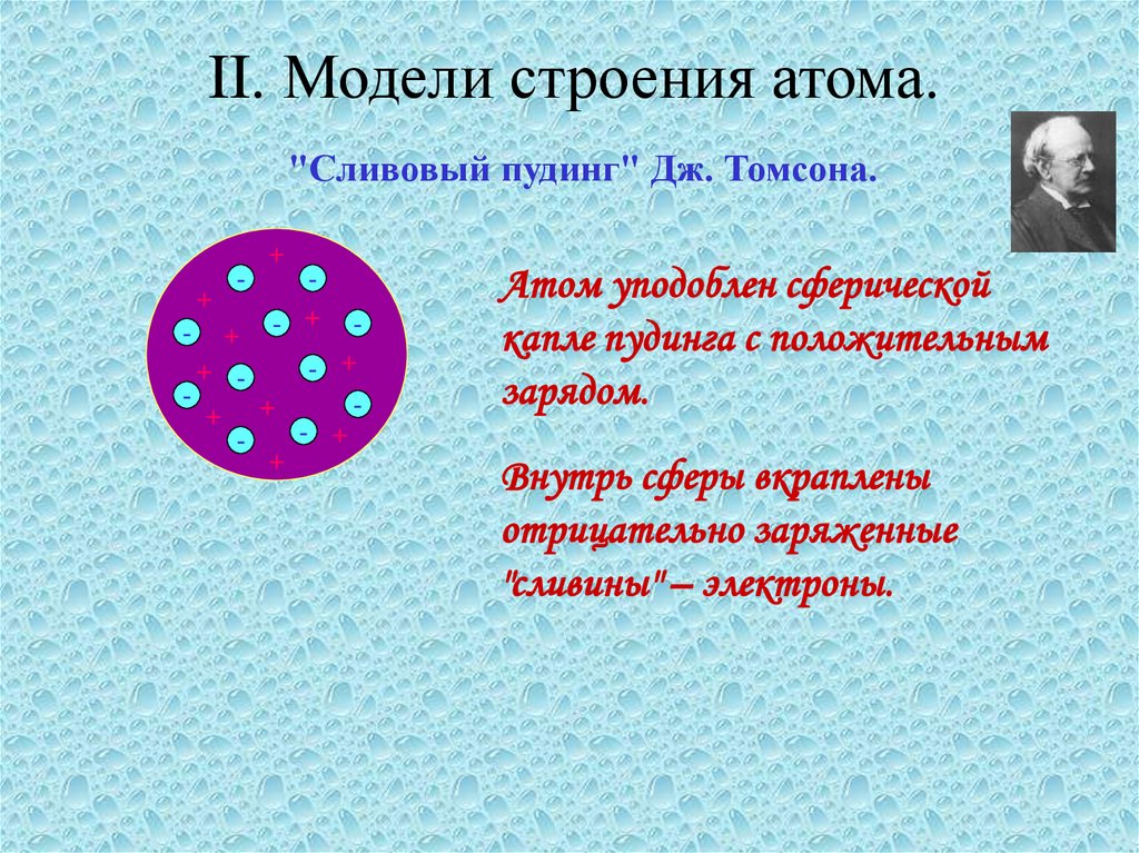 II. Модели строения атома."Сливовый пудинг" Дж. Томсона.