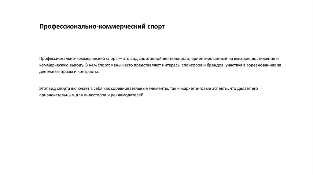 Профессионально-коммерческий спортПрофессионально-коммерческий спорт — это вид спортивной деятельности, ориентированный на высокие достижения и