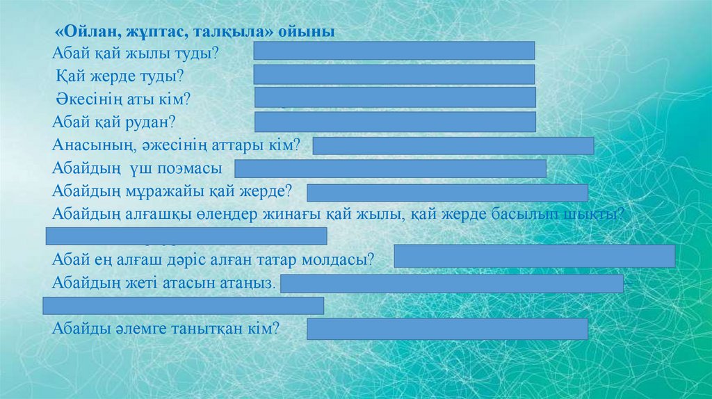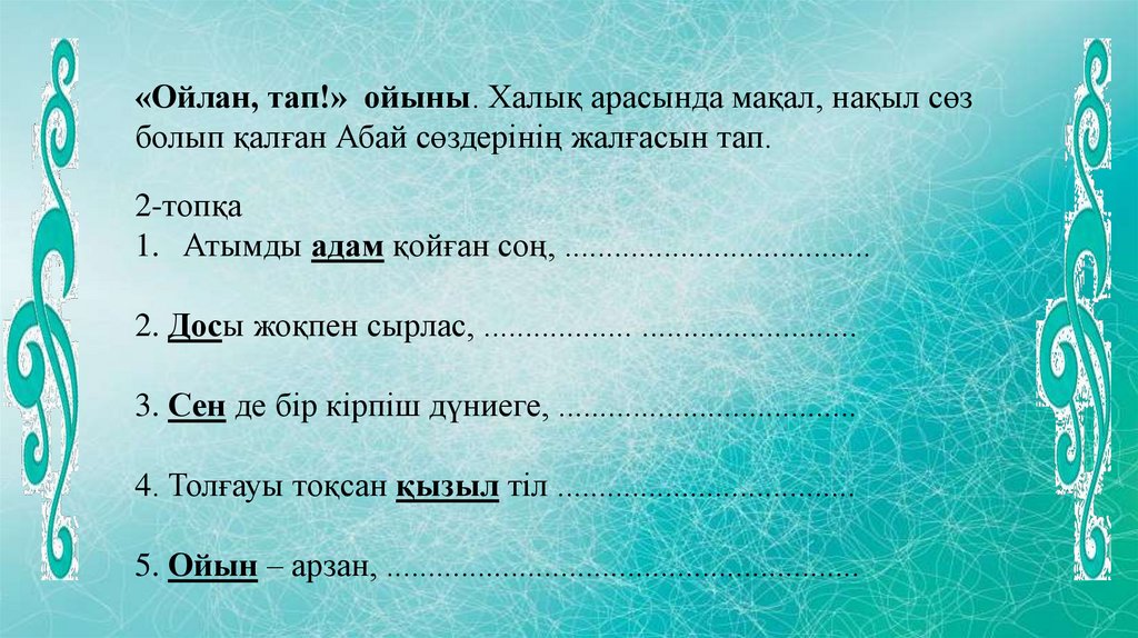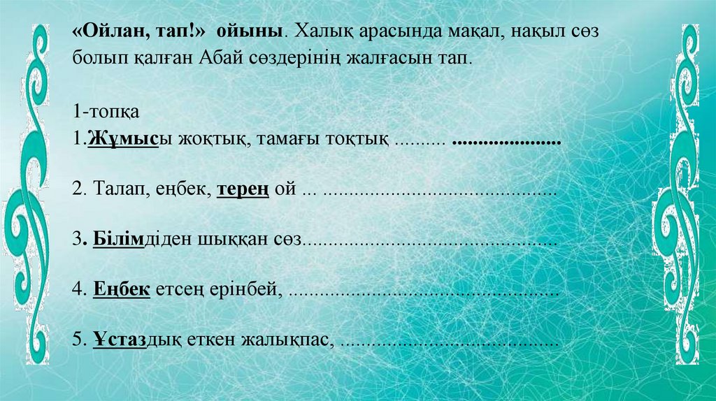 «Ойлан, тап!» ойыны. Халық арасында мақал, нақыл сөзболып қалған Абай сөздерінің жалғасын тап.