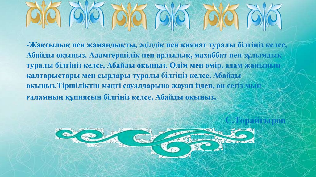 -Жақсылық пен жамандықты, әділдік пен қиянат туралы білгіңіз келсе,Абайды оқыңыз. Адамгершілік пен арлылық, махаббат пен зұлымдық