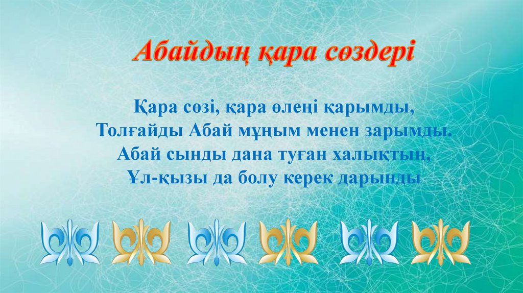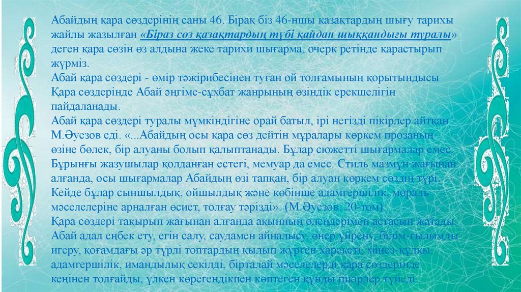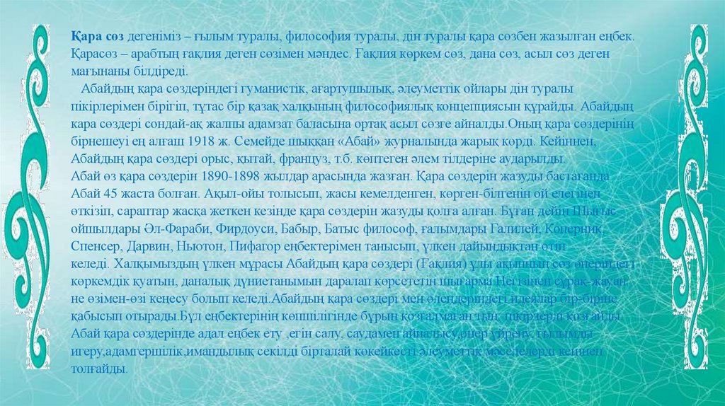 келеді. Халқымыздың үлкен мұрасы Абайдың қара сөздері (Ғақлия) ұлы ақынның сөз өнеріндегі