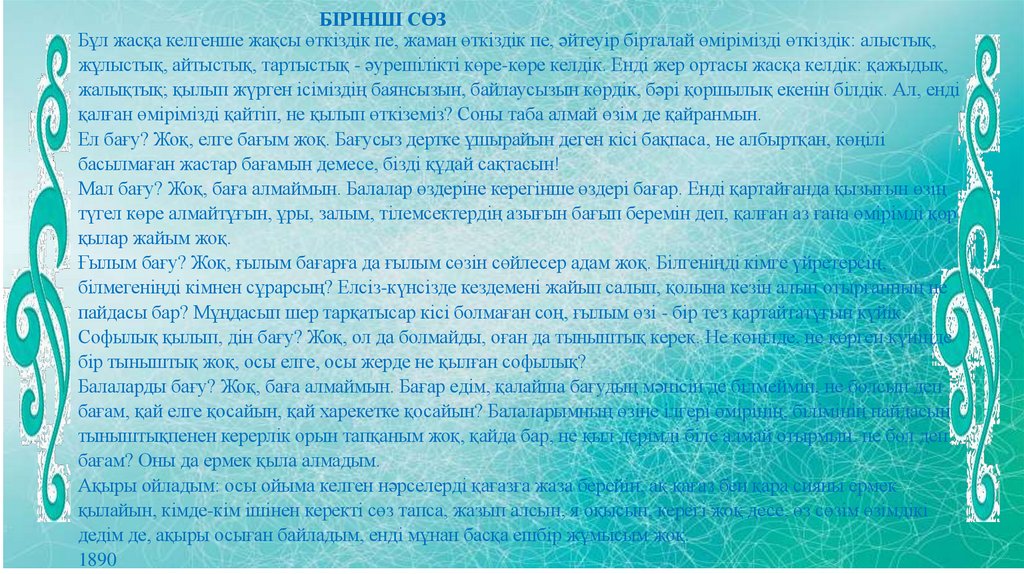 мәселелеріне арналған өсиет, толғау тәрізді». (М.Әуезов. 20-том).