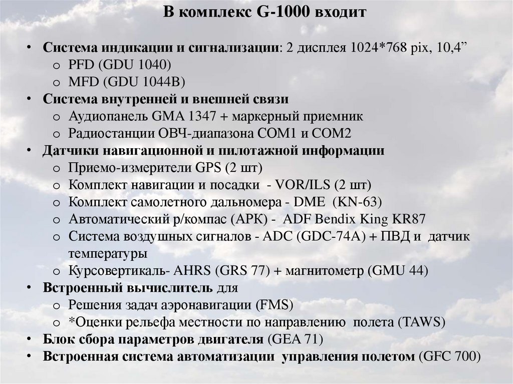 В комплекс G-1000 входит• Система индикации и сигнализации: 2 дисплея 1024*768 pix, 10,4”