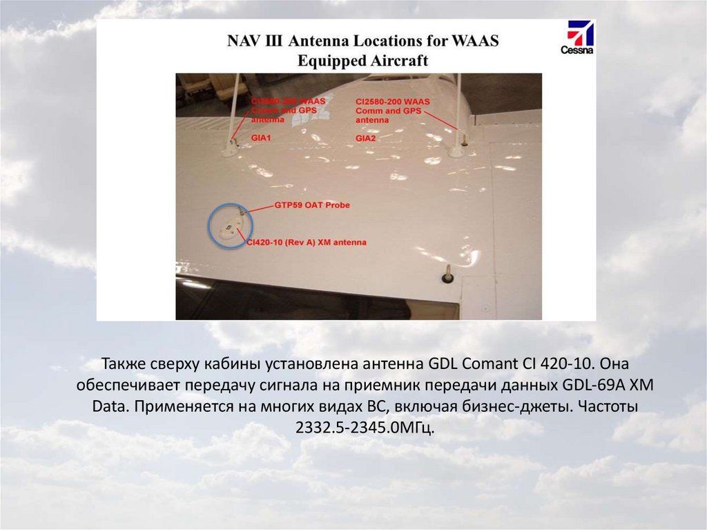 Также сверху кабины установлена антенна GDL Comant CI 420-10. Онаобеспечивает передачу сигнала на приемник передачи данных GDL-69A XM
