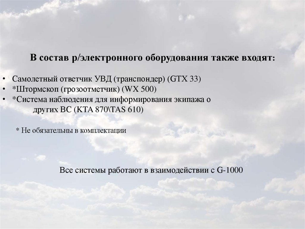 В состав р/электронного оборудования также входят:• Самолетный ответчик УВД (транспондер) (GTX 33)