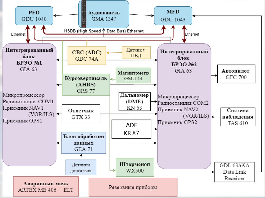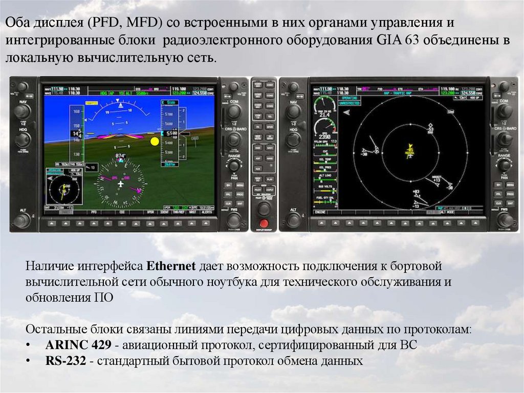 Оба дисплея (PFD, MFD) со встроенными в них органами управления иинтегрированные блоки радиоэлектронного оборудования GIA 63 объединены в