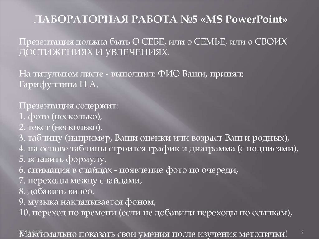 ЛАБОРАТОРНАЯ РАБОТА №5 «MS PowerPoint»Презентация должна быть О СЕБЕ, или о СЕМЬЕ, или о СВОИХ