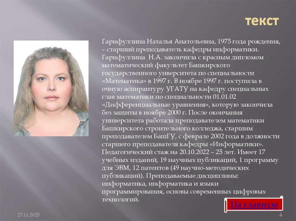 Гарифуллина Наталья Анатольевна, 1975 года рождения,– старший преподаватель кафедры информатики.