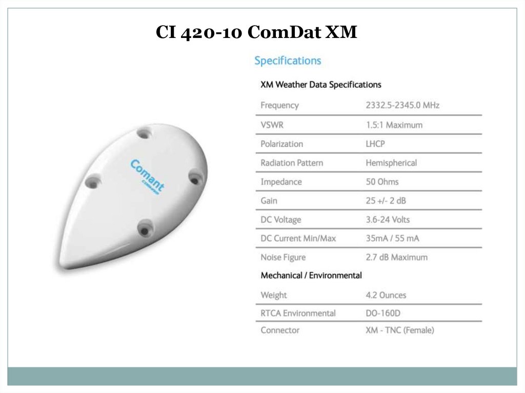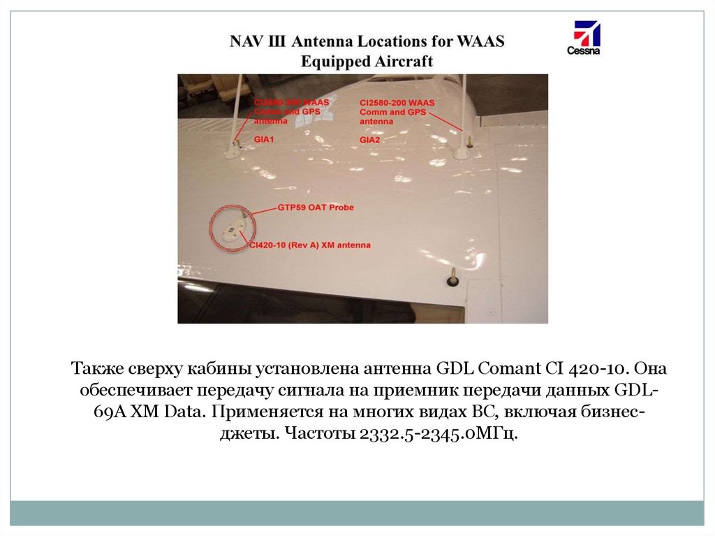 Также сверху кабины установлена антенна GDL Comant CI 420-10. Онаобеспечивает передачу сигнала на приемник передачи данных GDL69A XM Data. Применяется на многих видах ВС, включая бизнесджеты. Частоты 2332.5-2345.0МГц.