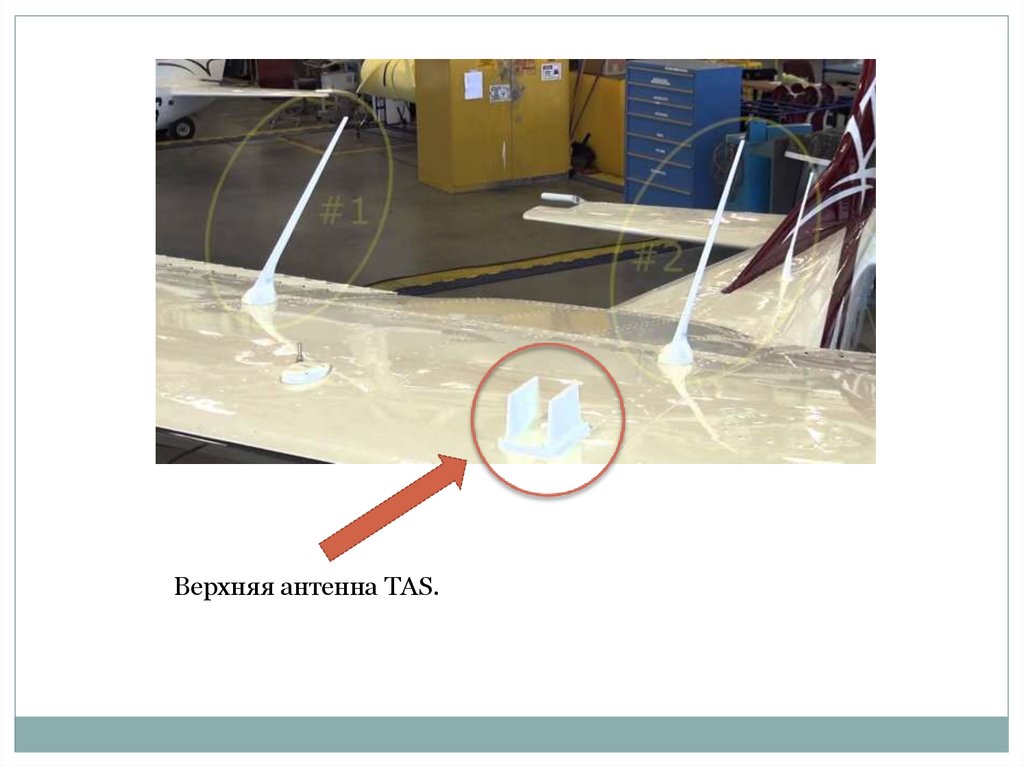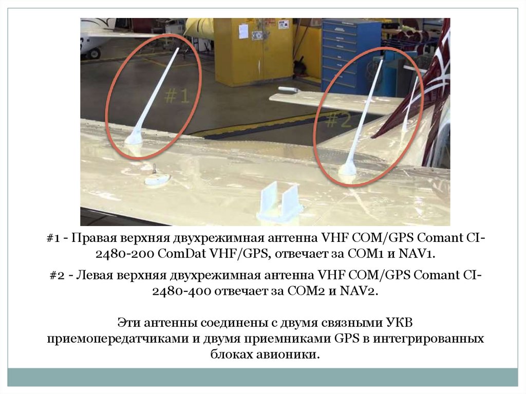#1 - Правая верхняя двухрежимная антенна VHF COM/GPS Comant CI2480-200 ComDat VHF/GPS, отвечает за COM1 и NAV1.#2 - Левая верхняя двухрежимная антенна VHF COM/GPS Comant CI2480-400 отвечает за COM2 и NAV2.