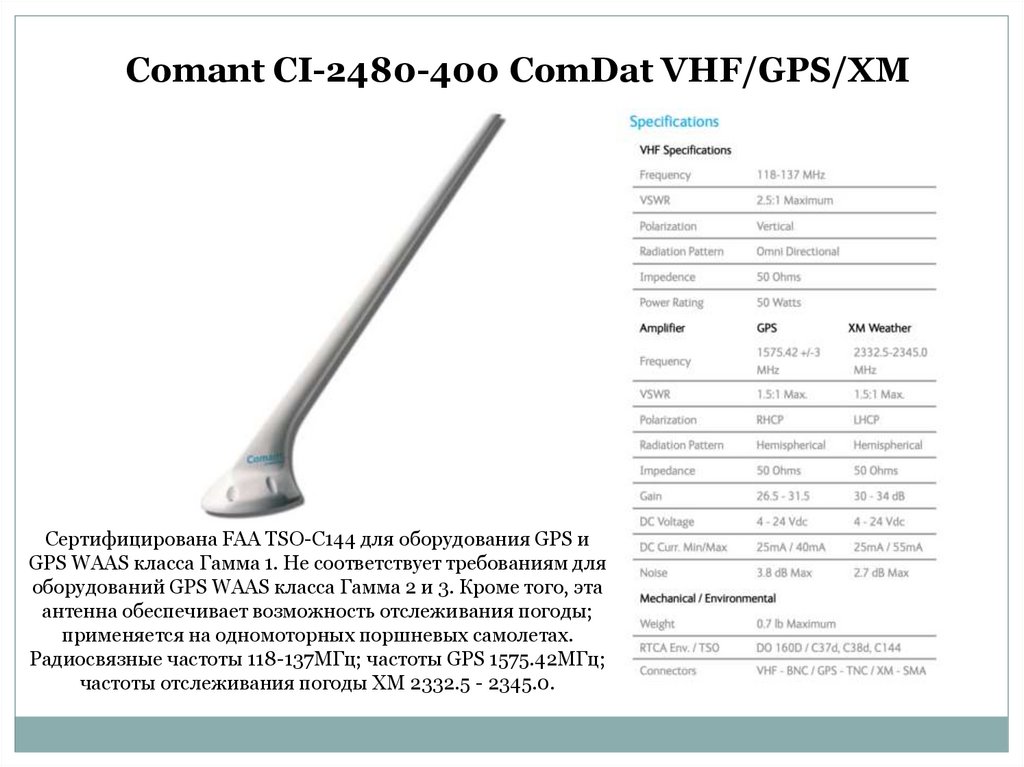 Comant CI-2480-400 ComDat VHF/GPS/XMСертифицирована FAA TSO-C144 для оборудования GPS и