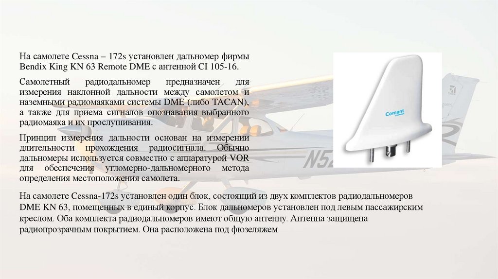 На самолете Cessna – 172s установлен дальномер фирмыBendix King KN 63 Remote DME с антенной CI 105-16.