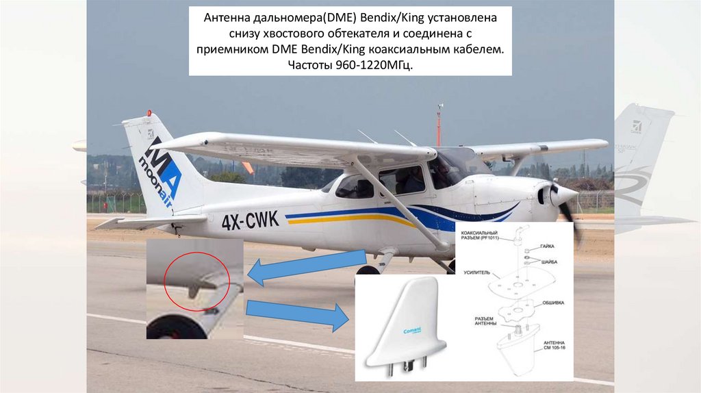 Антенна дальномера(DME) Bendix/King установленаснизу хвостового обтекателя и соединена с
