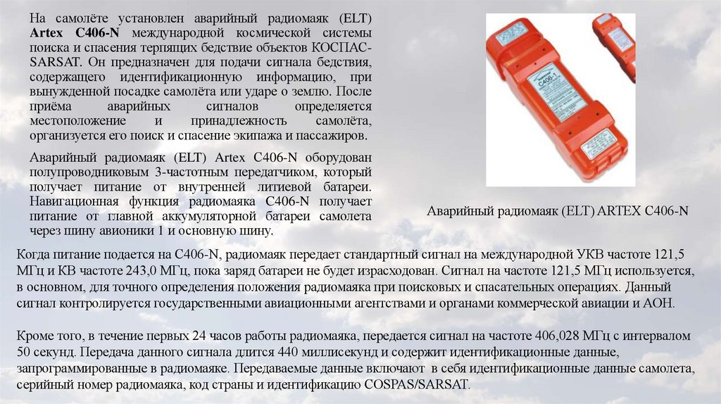 На самолёте установлен аварийный радиомаяк (ELT)Artex C406-N международной космической системы