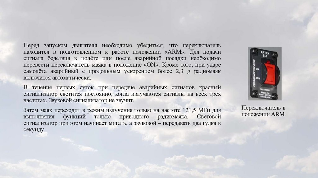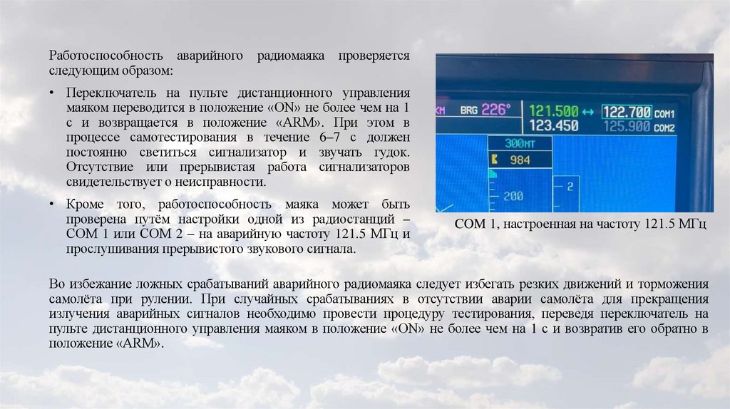 МГц и КВ частоте 243,0 МГц, пока заряд батареи не будет израсходован. Сигнал на частоте 121,5 МГц используется,