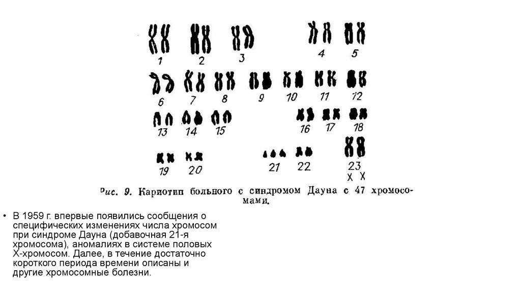 • В 1959 г. впервые появились сообщения оспецифических изменениях числа хромосом