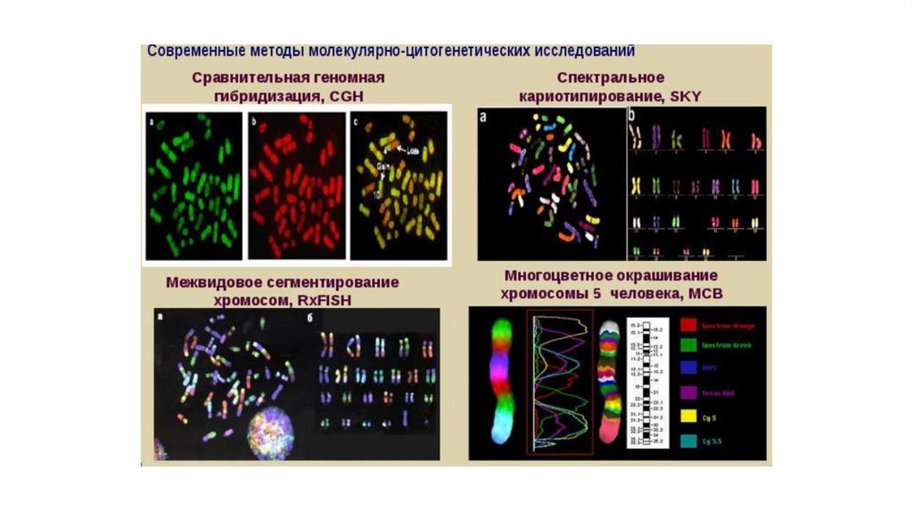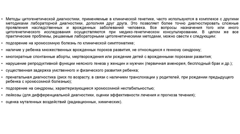 • Методы цитогенетической диагностики, применяемые в клинической генетике, часто используются в комплексе с другимиметодиками лабораторной диагностики, дополняя друг друга. Это позволяет более точно диагностировать сложные