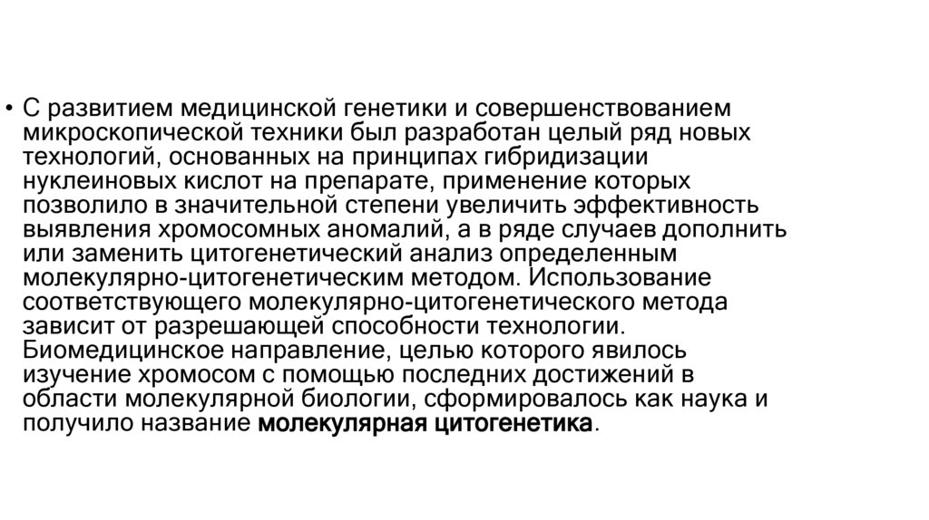• С развитием медицинской генетики и совершенствованиеммикроскопической техники был разработан целый ряд новых