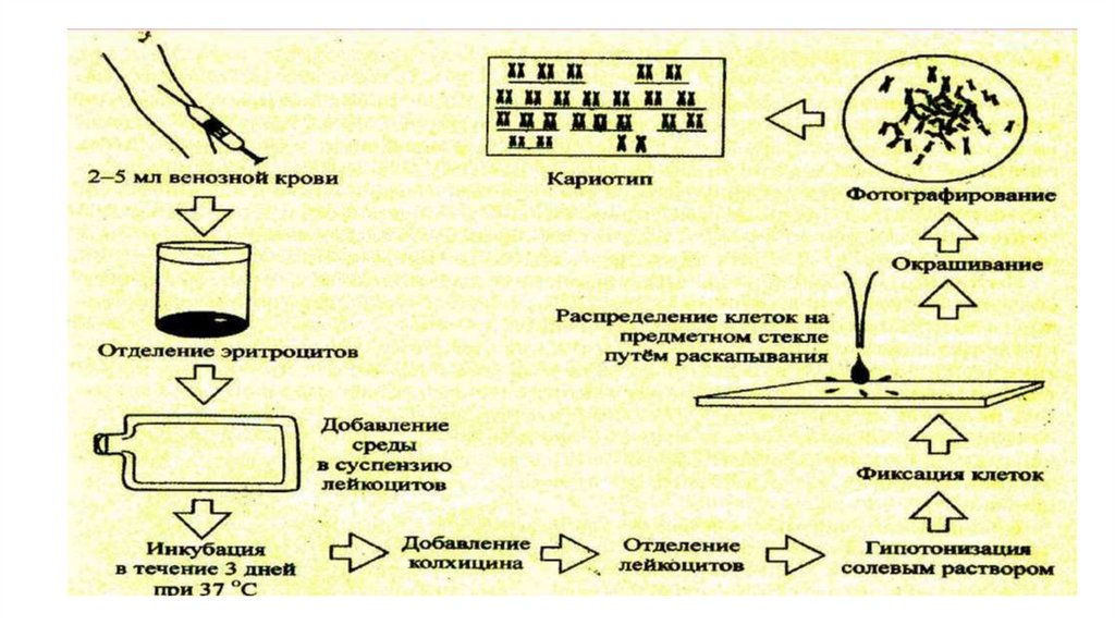 • Анализ кариотипа проводят в три этапа: культивирование лимфоцитовкрови, окраска препарата и его микроскопический анализ. Культивирование