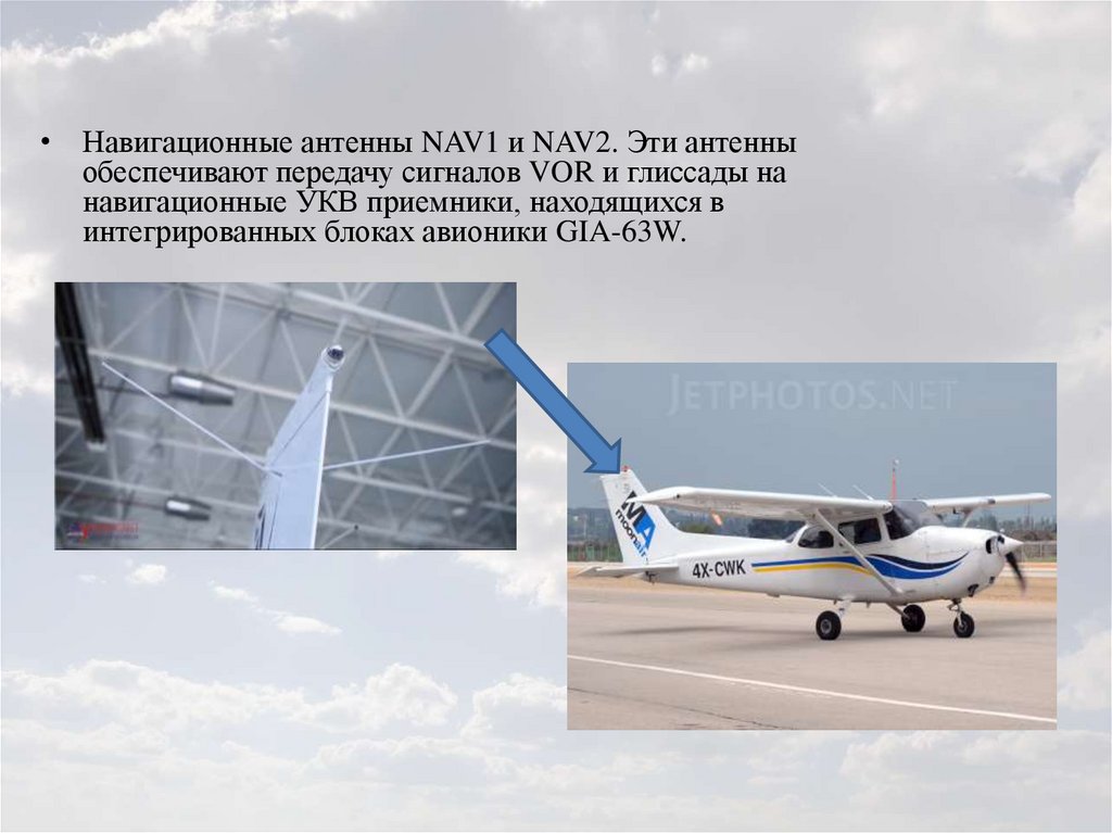 • Навигационные антенны NAV1 и NAV2. Эти антенныобеспечивают передачу сигналов VOR и глиссады на