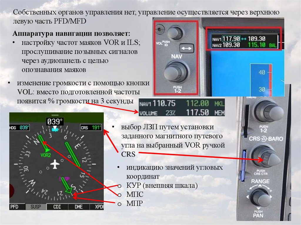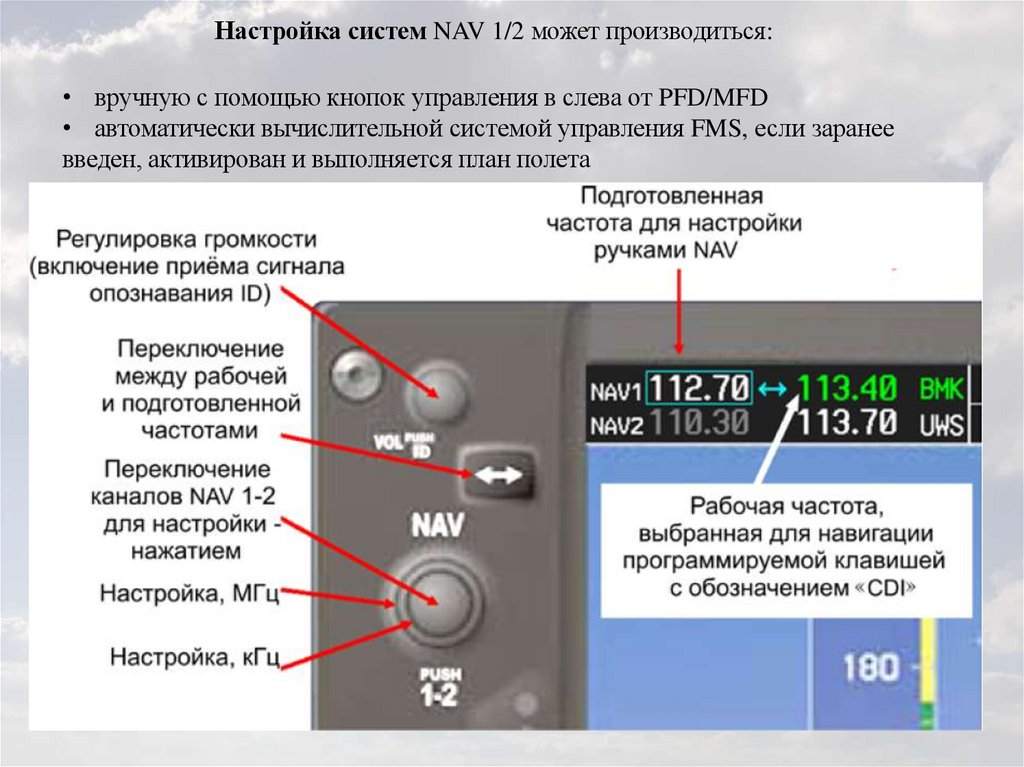 Настройка систем NAV 1/2 может производиться:• вручную с помощью кнопок управления в слева от PFD/MFD