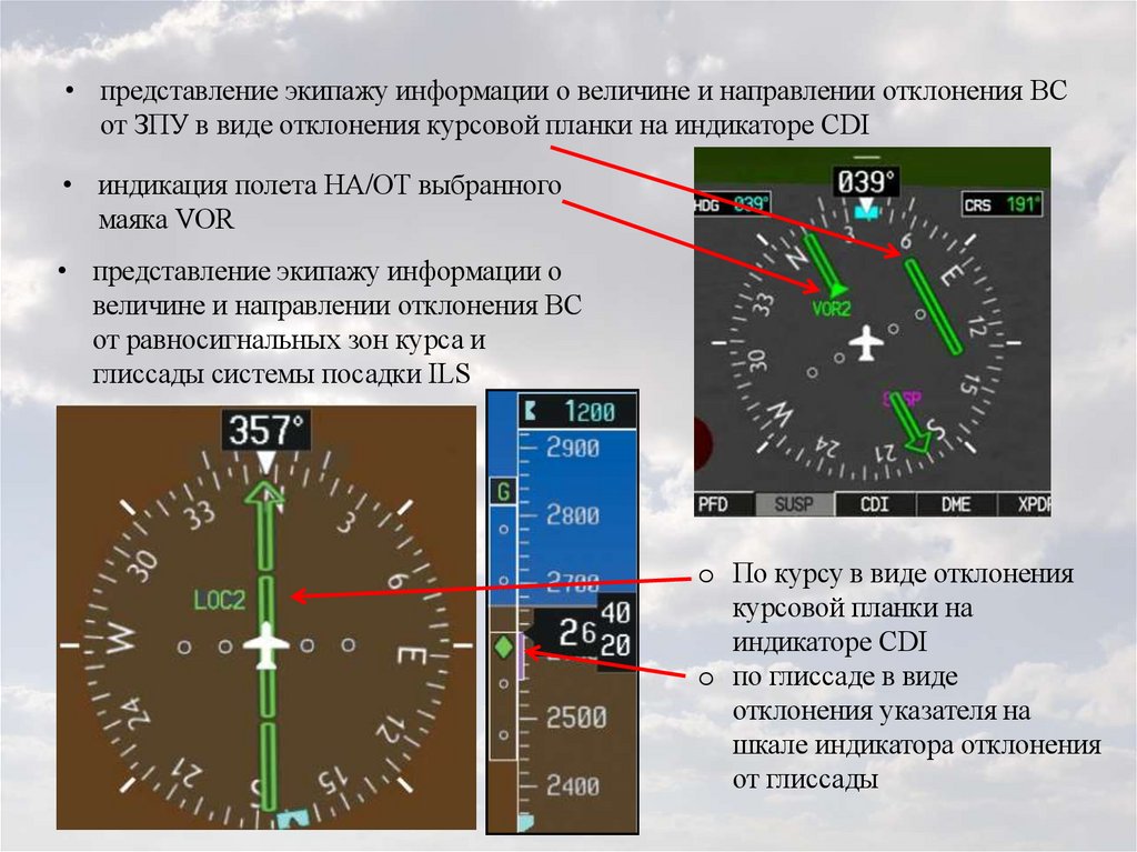 • представление экипажу информации о величине и направлении отклонения ВСот ЗПУ в виде отклонения курсовой планки на индикаторе CDI
