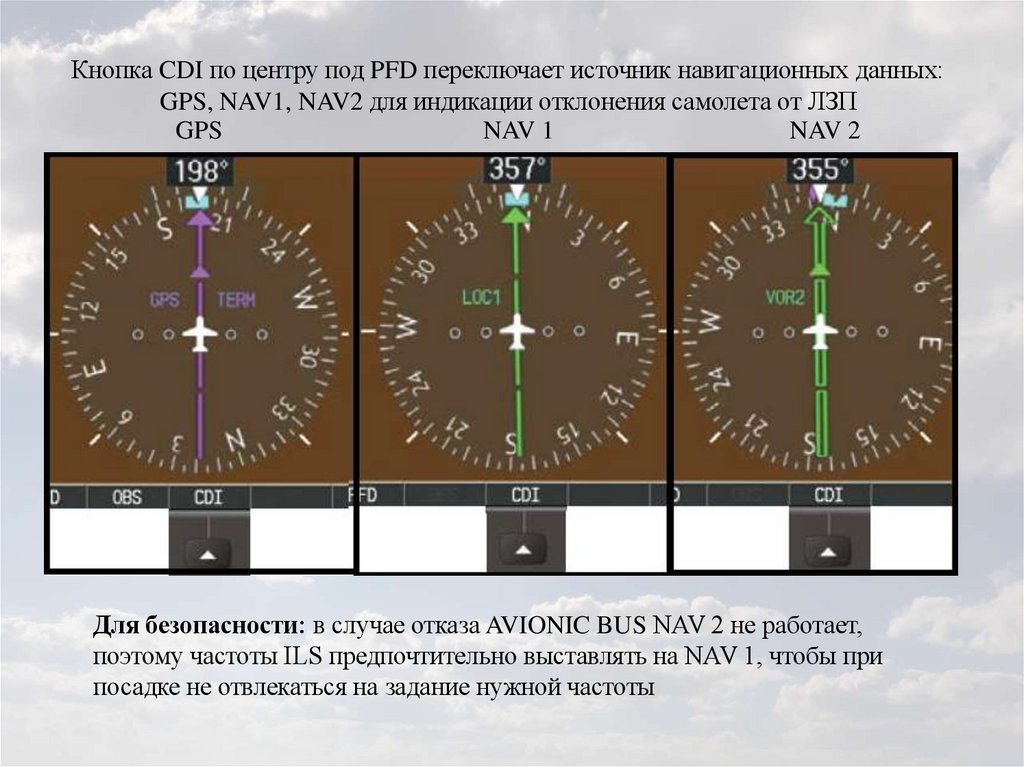 Кнопка CDI по центру под PFD переключает источник навигационных данных:GPS, NAV1, NAV2 для индикации отклонения самолета от ЛЗП