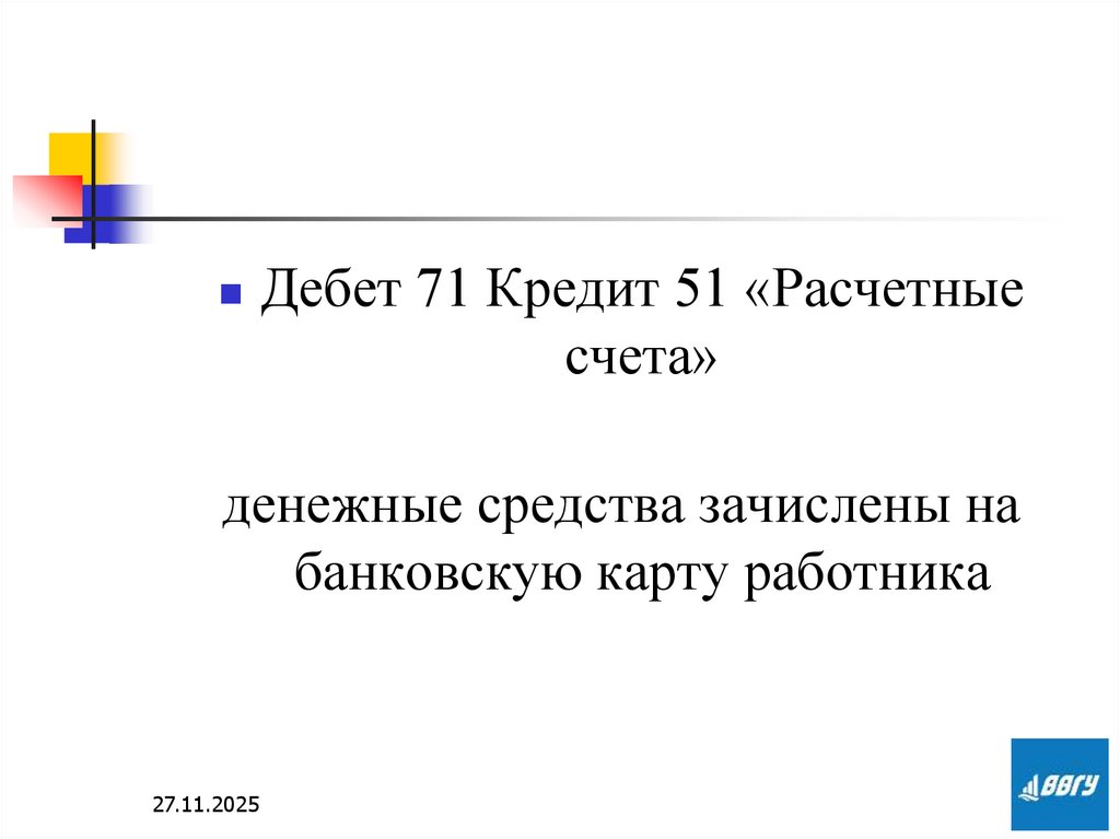 Дебет 71 Кредит 51 «Расчетныесчета»