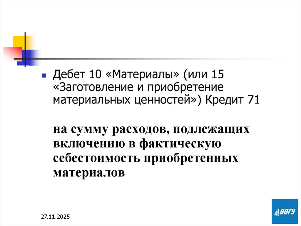 Дебет 10 «Материалы» (или 15«Заготовление и приобретение