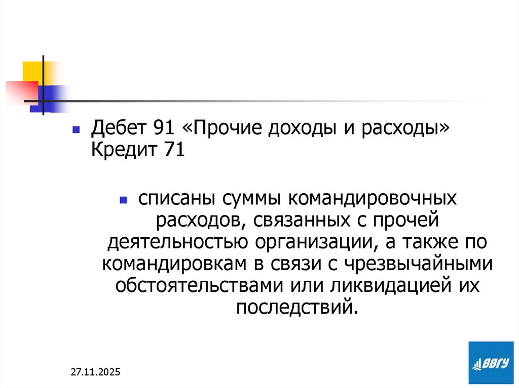 Дебет 91 «Прочие доходы и расходы»Кредит 71
