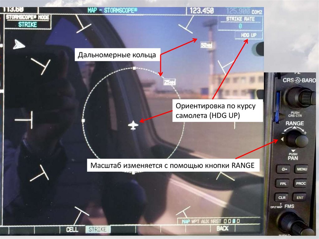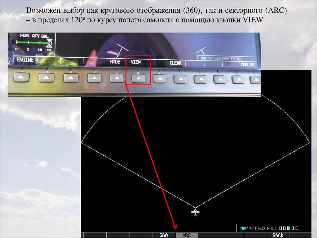 Возможен выбор как кругового отображения (360), так и секторного (ARC)– в пределах 120⁰ по курсу полета самолета с помощью кнопки VIEW