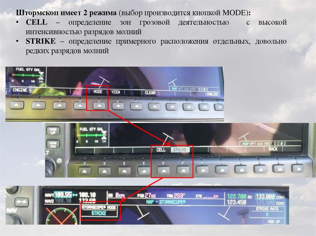 Штормскоп имеет 2 режима (выбор производится кнопкой MODE):• CELL – определение зон грозовой деятельностью