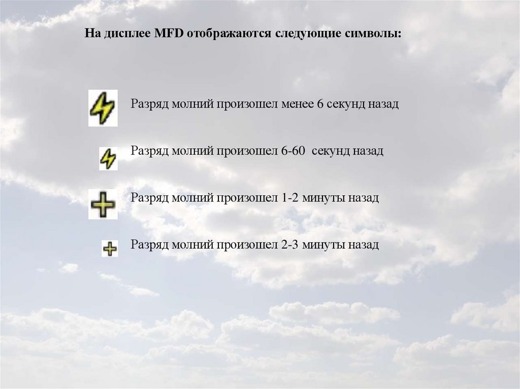 На дисплее MFD отображаются следующие символы:Разряд молний произошел менее 6 секунд назад