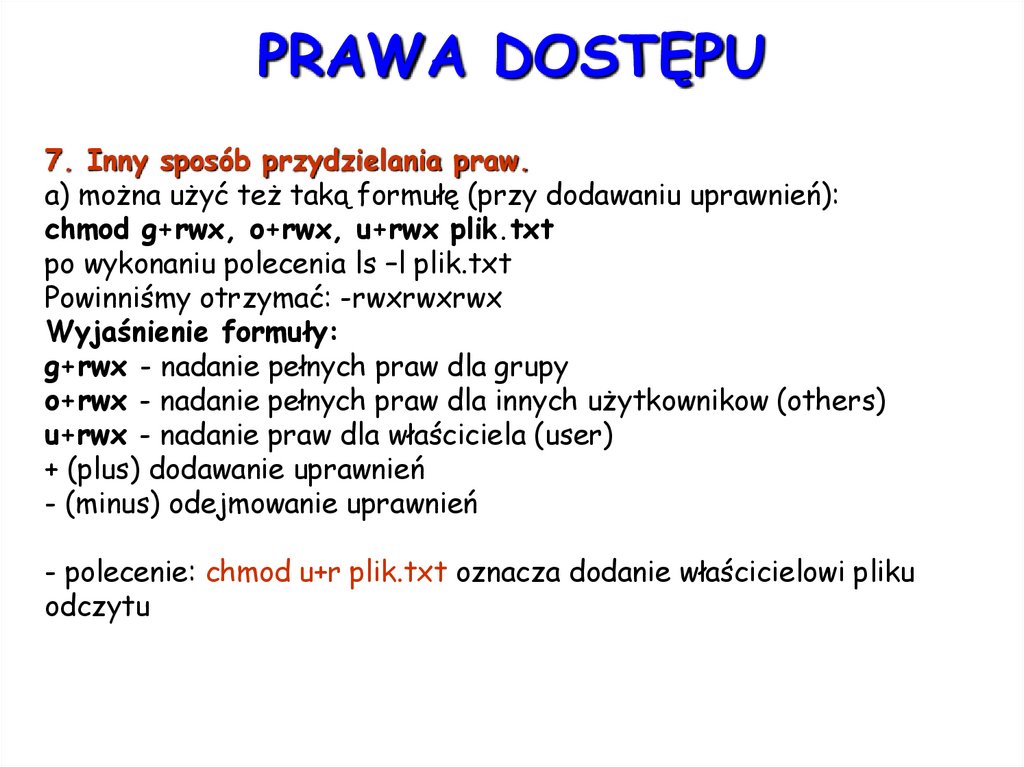 - polecenie: chmod u+r plik.txt oznacza dodanie właścicielowi pliku