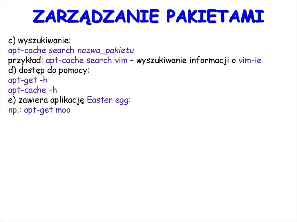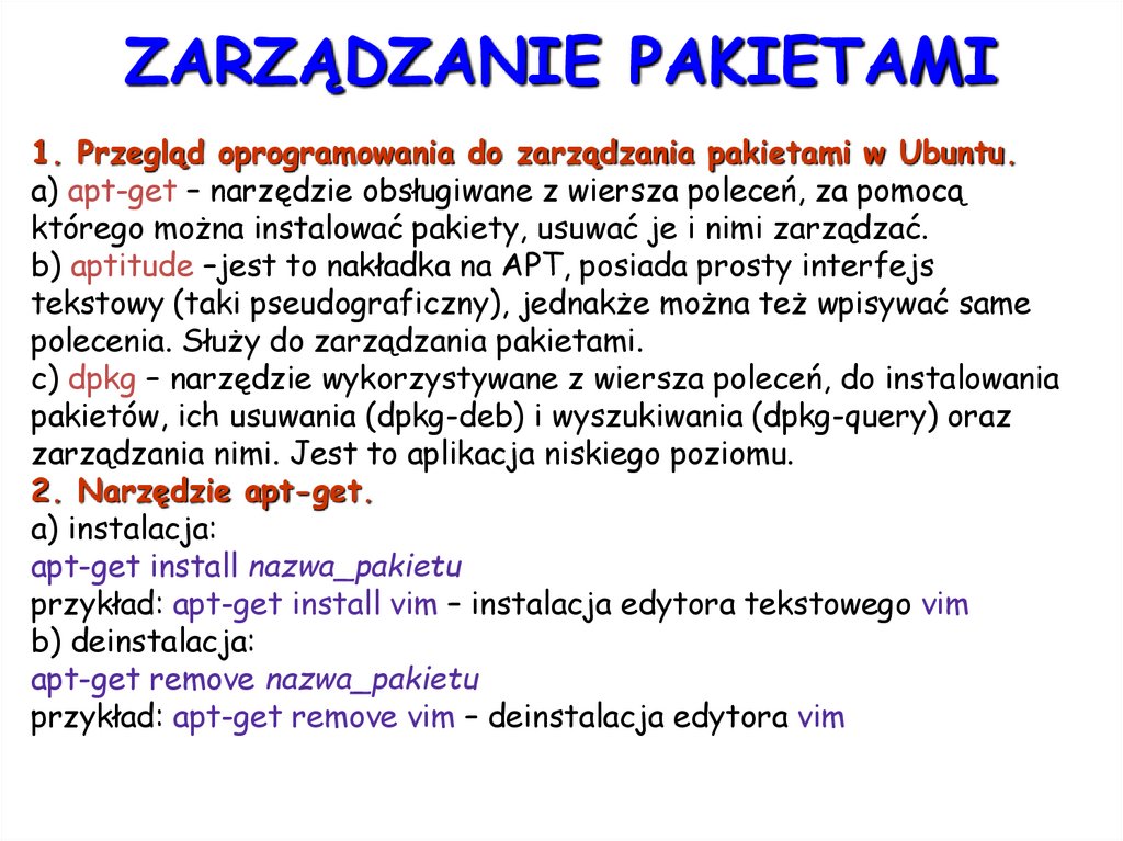 przykład: apt-get install vim – instalacja edytora tekstowego vim