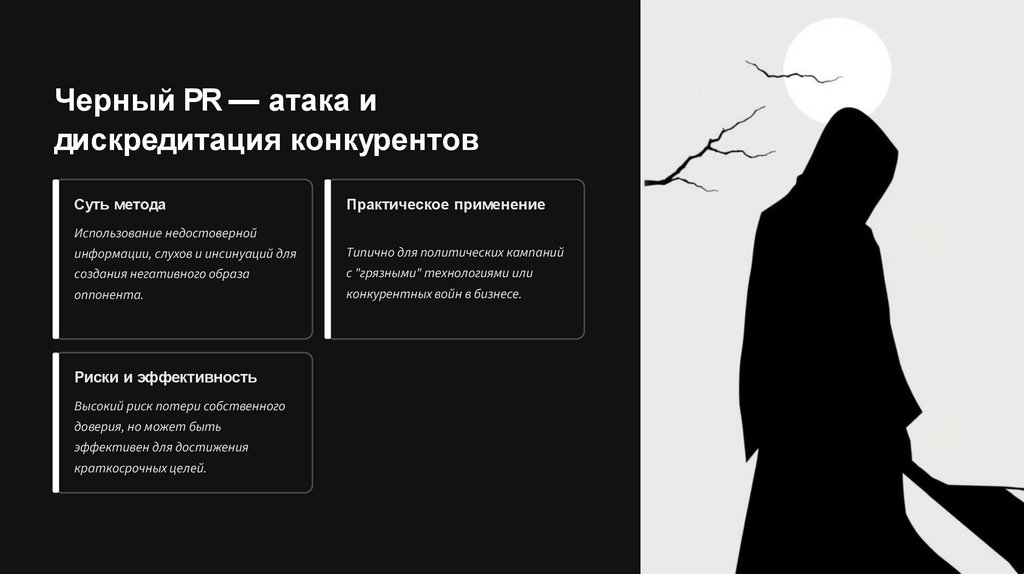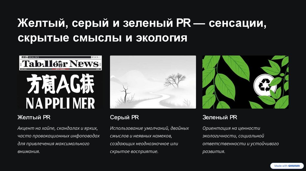 Черный и желтый PR — могут обеспечить краткосрочный эффект, но сопряжены с высокими репутационными рисками.
