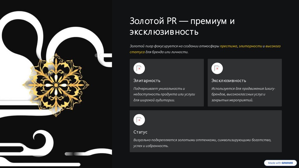 Золотой пиар фокусируется на создании атмосферы престижа, элитарности и высокого