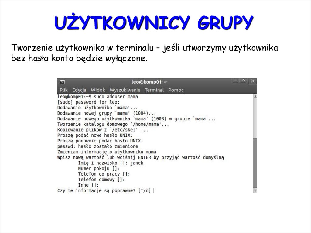 UŻYTKOWNICY GRUPYTworzenie użytkownika w terminalu – jeśli utworzymy użytkownika