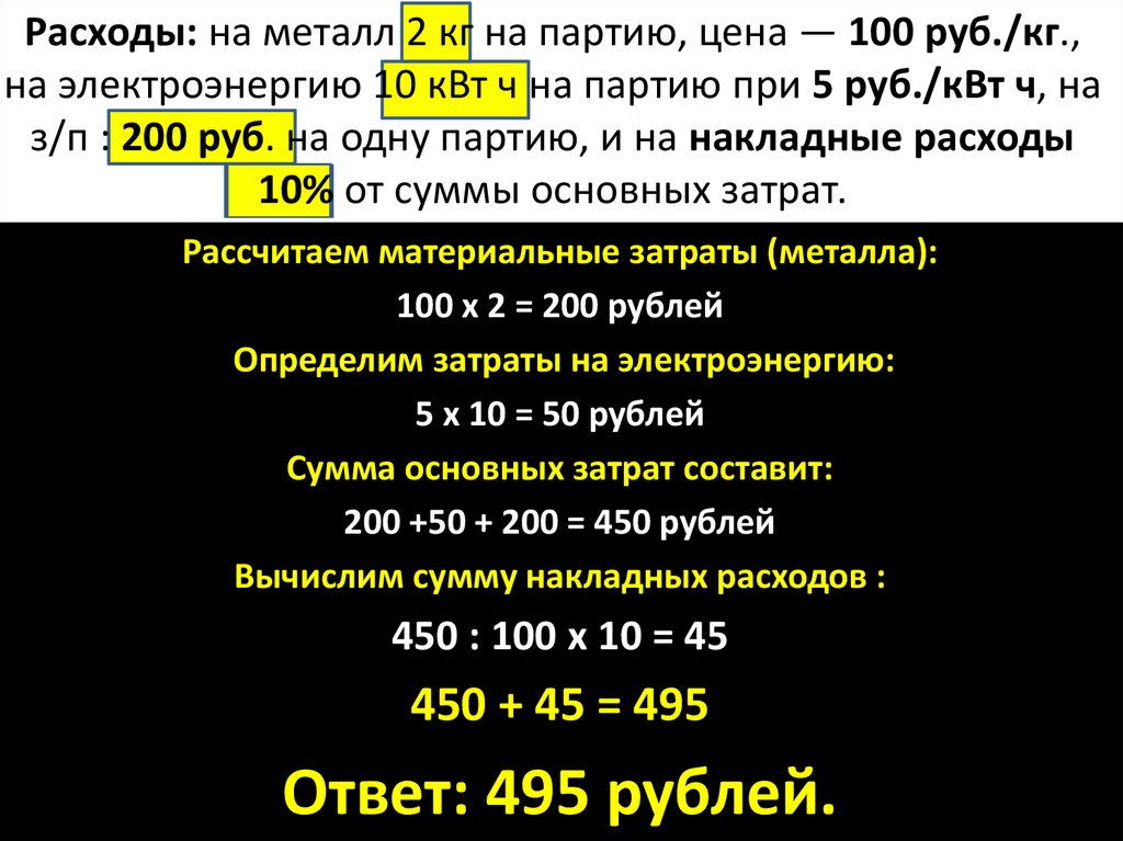Расходы: на металл 2 кг на партию, цена — 100 руб./кг.,на электроэнергию 10 кВт ч на партию при 5 руб./кВт ч, на