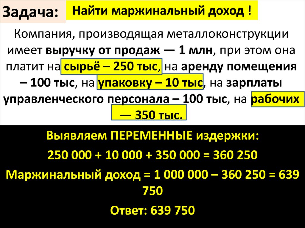 Маржинальный доход = 1 000 000 – 360 250 = 639