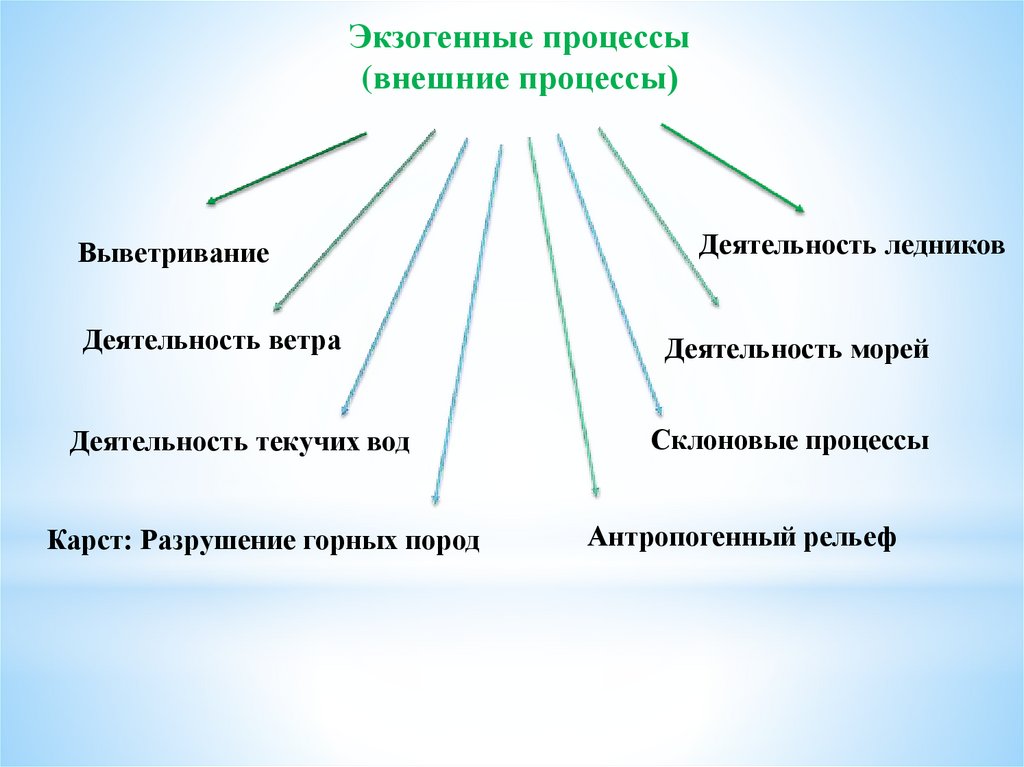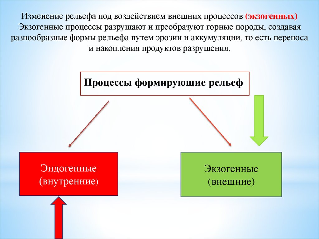 Изменение рельефа под воздействием внешних процессов (экзогенных)Экзогенные процессы разрушают и преобразуют горные породы, создавая