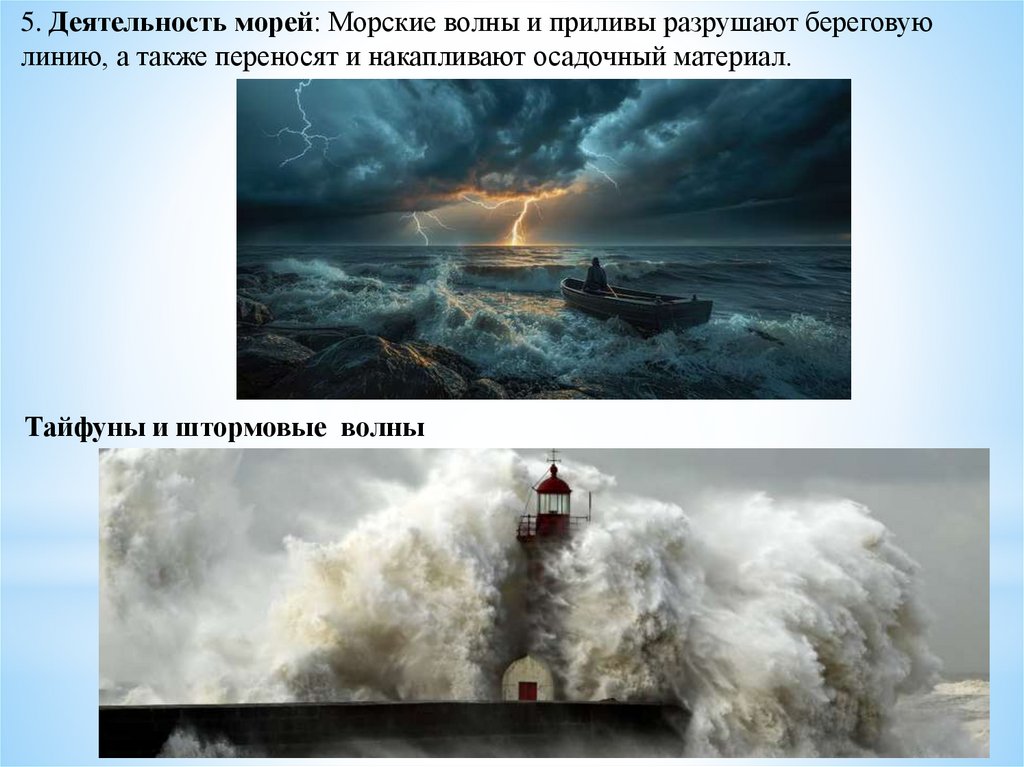 5. Деятельность морей: Морские волны и приливы разрушают береговуюлинию, а также переносят и накапливают осадочный материал.