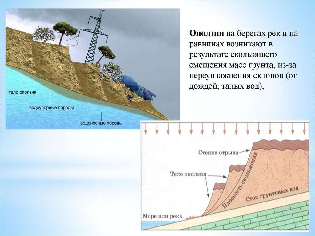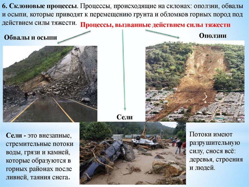 6. Склоновые процессы. Процессы, происходящие на склонах: оползни, обвалыи осыпи, которые приводят к перемещению грунта и обломков горных пород под