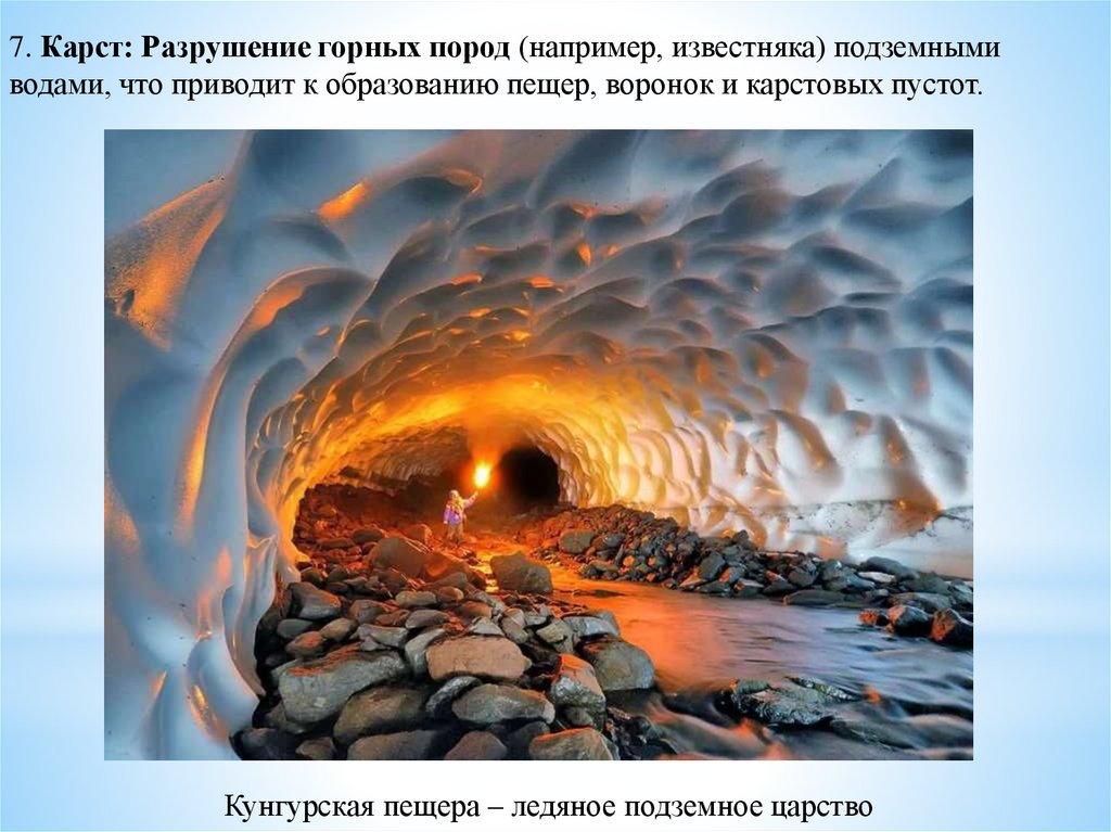7. Карст: Разрушение горных пород (например, известняка) подземнымиводами, что приводит к образованию пещер, воронок и карстовых пустот.