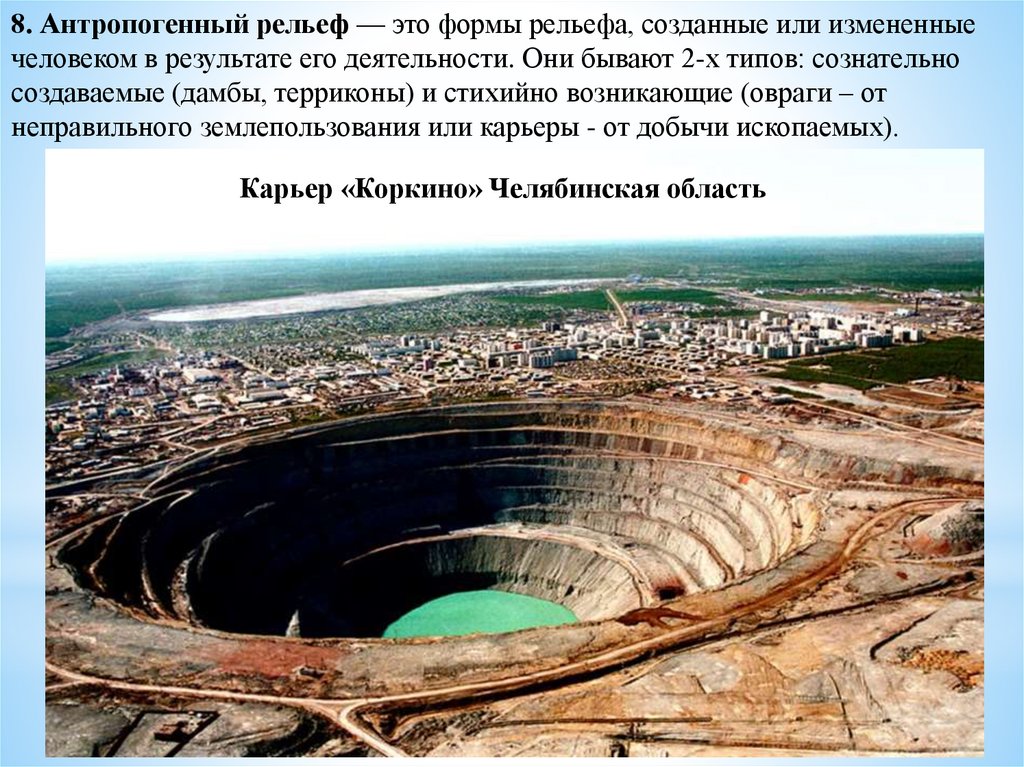 8. Антропогенный рельеф — это формы рельефа, созданные или измененныечеловеком в результате его деятельности. Они бывают 2-х типов: сознательно